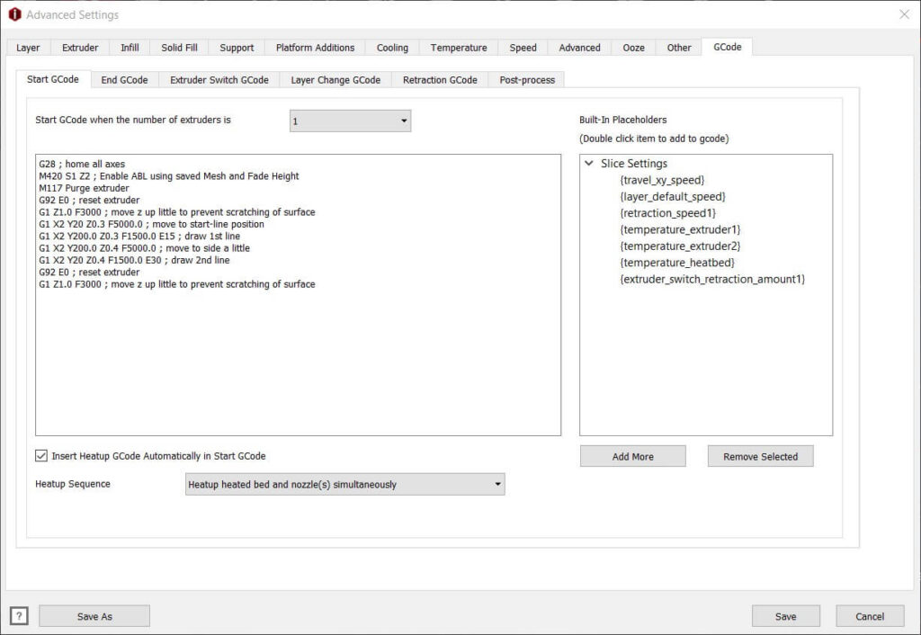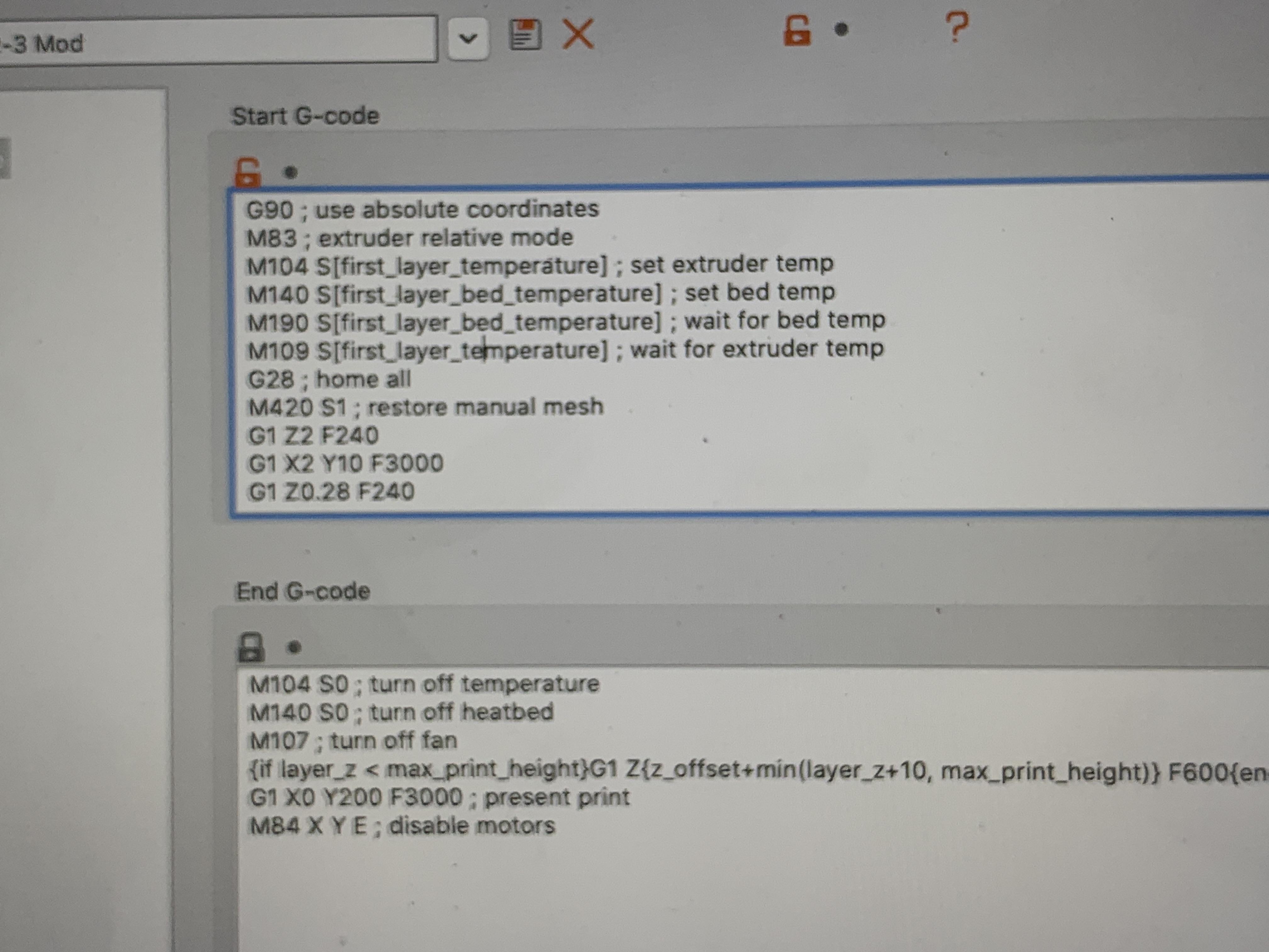 Start warming extruder to 160: Wait for heat bed temperature: M190 s {ma t erial_be d _ t empera t ure_layer_0} ; Move to side a little. Start warming extruder to 160: I copy and pasted my start gcode from cura that works perfectly there and it. Home all axes g1 z2.0 f3000 ; M104 s {ma t erial_prin t _ t empera t ure_layer_0} ;. Draw the second line g92 e0 ;
